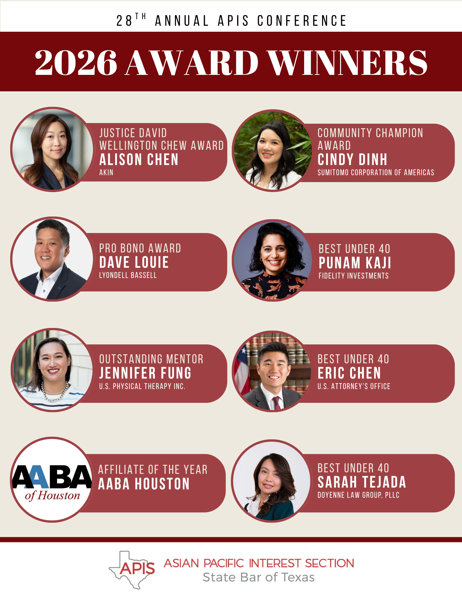 The Asian Pacific Interest Section (APIS) of the State Bar of Texas has been connecting Asian and South Asian legal professionals, as well as lawyers interested in promoting issues of justice, equity, and opportunity impacting Asian and South Asian communities, since 1995. APIS supports its members and local bar affiliate organizations throughout Texas by providing mentorship, networking, and professional development opportunities.
